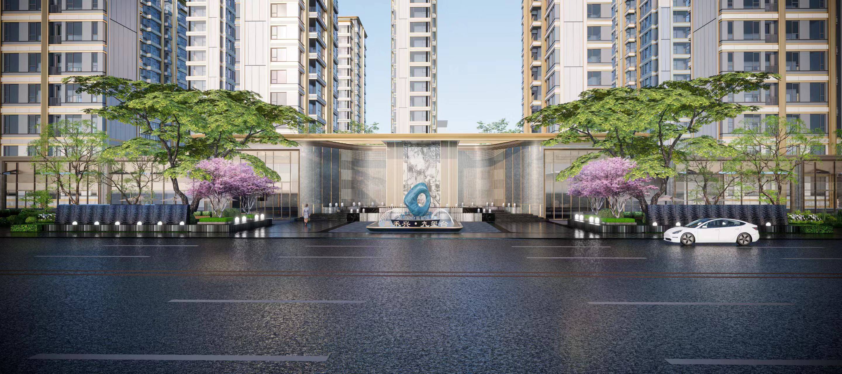 正大门:石材+铝板+金属格栅,面宽约40米,高约8米,给足了业主足够的尊贵;南北两边的入户门规格也非常高,石材+铝板。不管走哪边回小区都有满满的仪式感。