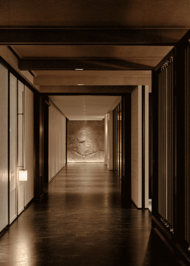 铜门之内是一座静谧内庭院,贝金米黄石材铺地,两侧水纹轻漾,一棵百年老庄紫薇寓意着“紫气东来”。