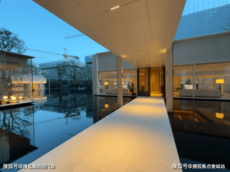 踞于水院中轴之上的“霞光亭”,纤薄顶棚以镂空金属格栅勾勒云纹,倒影入水时竟似悬亭踏浪,恍惚间亭非亭、廊非廊,仿佛界破虚实。