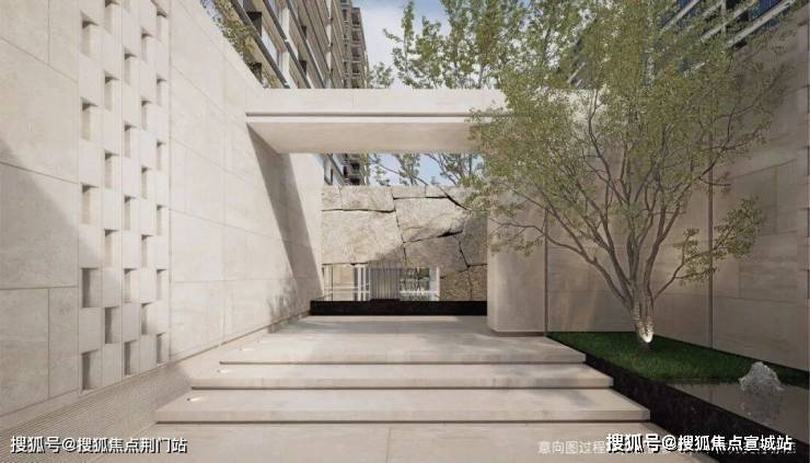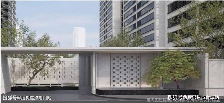 项目西侧主入口是一个宽约35米、高约5.5米的“静藏琉光”大门,景观墙层叠错落,高挑檐顶搭配古朴铜门,宏伟中透着灵动的艺术感。