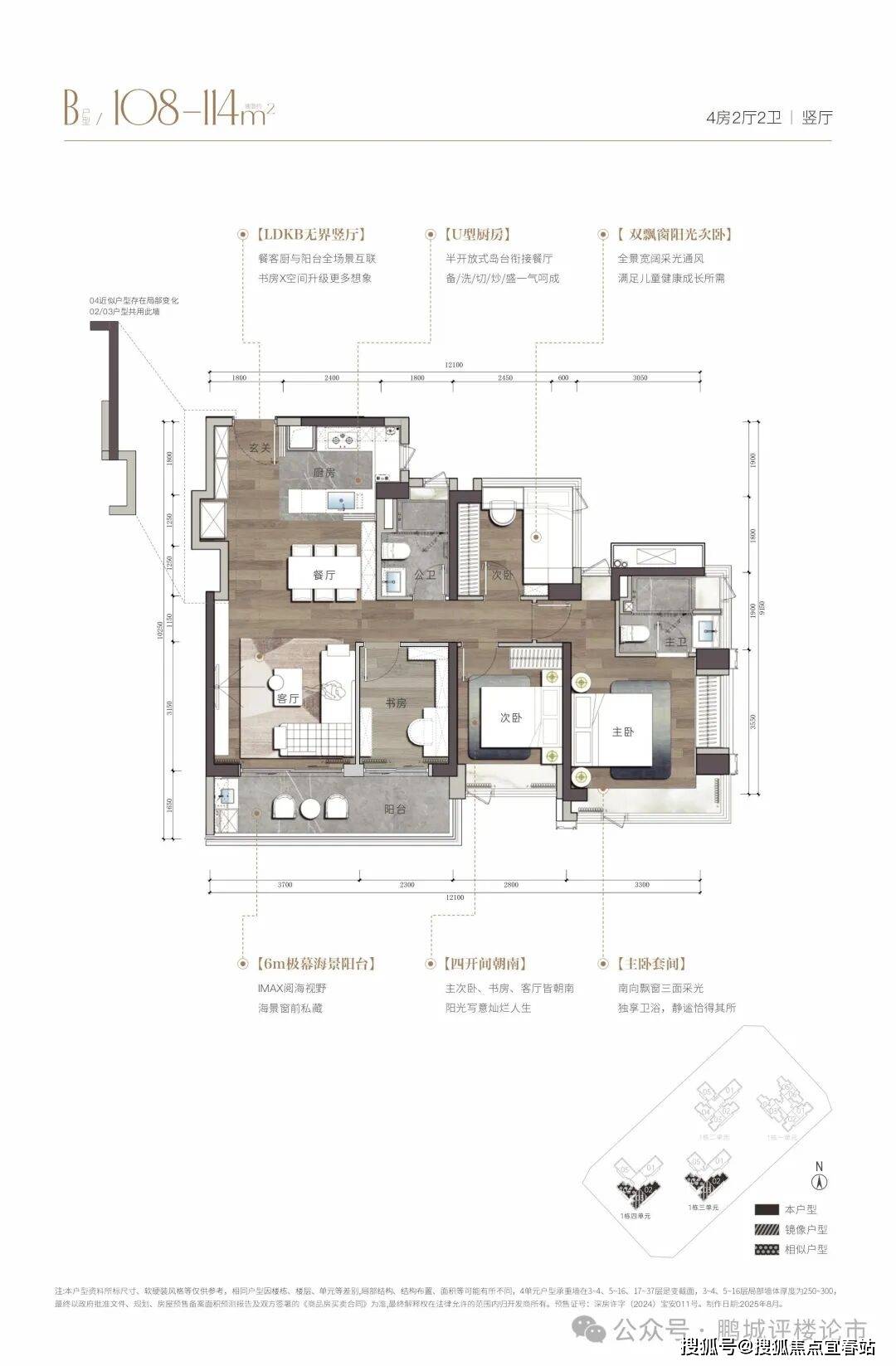 建面约108-143㎡海幕纯四房,臻藏级南向湾海视野,LDKB人性化动线设计,格局方正、高实用率,打造独立玄关、双飘窗主卧、步入式衣帽间等个性化空间。