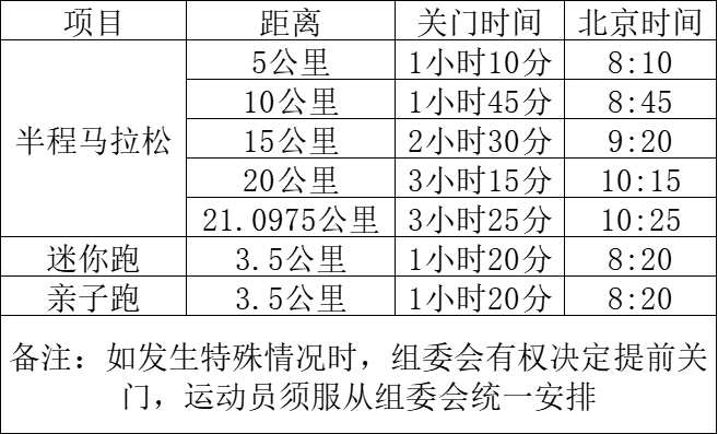 为保证参赛选手比赛安全和城市道路交通秩序,各公里点关门后,比赛计时感应地毯即停止工作,赛道解除交通管制并恢复道路正常交通,参赛选手应及时停止比赛退出赛道。退出比赛的选手可搭乘组委会提供的援助车或自行选乘公共交通抵达相应项目的终点。否则,由此引发的事故将由该选手自行承担相应法律责任和赔偿责任。
